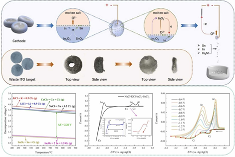 2023年6月,安徽工业大学徐亮(第一作者),赵卓(通讯作者)等在Journal of Environmental Chemical Engineering上发表了题为“Recycling of waste indium tin oxide target for In-Sn alloy production based on molten salt electrochemistry”的研究论文。