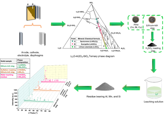 废旧锂离子电池火法熔炼回收工艺具有原料适应性强,流程短的显著优势,已实现Co、Ni、Cu的高效合金化回收,但Li高分散态赋存于尖晶石(铝酸锂或锰酸锂)、硅酸盐矿相中,且含量较低(Li2O<3wt%)难以有效提取。本文受天然锂辉石(LiAlSi2O6)独特的单斜晶系特征及Li的高含量属性启发,提出了基于锂辉石型(Li2O-Al2O3-4SiO2)熔炼渣系的火法回收方法,可实现Co、Ni 和 Cu 的合金化回收率>99%,同时99%以上的Li富集在高品位 (Li2O,6.0–9.0wt%)含锂炉渣中,其锂含量超过锂辉石精矿标准(Li2O,5.5wt%)。在模拟工业条件下,该富锂渣的硫酸化焙烧-浸出评价性实验结果表明锂的浸出率>93%,证明了该富锂渣具备锂的高效可回收特性。该方法获授权发明专利1项(ZL 202210660489.X)。