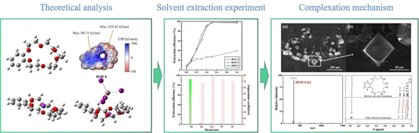 本文针对废弃液晶显示器(LCD)浸出液复杂体系,以冠醚(CE)为基础开发了对铟具有高选择性的萃取剂;同时,向溶液中引入KI,使铟形成InI4−络阴离子,削弱了铟的水合作用。实验考察了KI浓度、CE空腔大小和CE/In摩尔比对萃取过程的影响;通过密度泛函理论(DFT)计算,从几何结构优化、热力学和静电势等方面对溶剂萃取过程中铟与水分子和CE的相互作用进行了理论分析;通过质谱、1H NMR谱和SEM-EDS进一步阐明了KI存在下CE与铟的络合机理。论文的研究结果对于从复杂体系中选择性提取铟具有良好的理论指导意义。