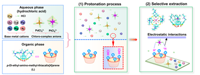 本文设计并合成了上沿叔胺功能基团修饰的硫杂杯[4]芳烃衍生物,并以其作为萃取剂对盐酸介质中的Pt(IV)进行了系统性实验研究。实验结果表明,该萃取剂对Pt(IV)具有优异的配位能力,在最佳条件下萃取率可达90%以上,同时在复杂离子(Pt/Pd/Ce/La/Fe/Ni/Mg/Al)体系中可保持对Pt(IV)的良好选择性;通过斜率分析、SEM-EDS和1H NMR滴定,结合DFT模拟计算,进一步研究了萃取过程的配位机理,结果表明:萃取剂首先与HCl结合进行质子化形成铵盐络合物,然后进一步与PtCl62-发生阴离子交换反应,从而实现对盐酸介质中Pt(IV)的高效选择性萃取。