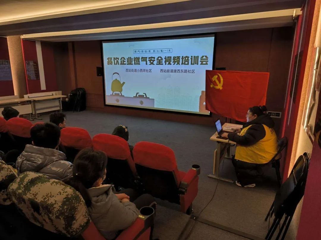 在培训会上,西站街道小西坪社区的安全专干首先宣读了《关于开展城镇使用燃气的餐饮企业安全培训工作的通知》和与会相关要求,接着切入主题,组织大家集中收看了由专业的燃气安全和安全领域专家进行的视频授课。视频中通报了近两年因燃气主体责任落实不到位及安全认知不足导致的重大燃气安全事故,三位专家结合实际案例,深入浅出地分析了餐饮燃气安全的重要性以及应对突发情况的方法,对餐饮经营场所瓶装液化石油气使用常见风险点、城镇燃气生产安全典型事故案例等进行了详细的分析和讲解,对餐饮企业开展安全检查过程中发现的隐患问题,明确了整改措施和要求。随后,还观看了餐饮经营场所燃气使用消防安全和事故应急处置的警示教育片,整个培训围绕餐饮企业燃气安全基本知识、燃气器具的规范使用、保养检查、事故预防、燃气泄露事故应急处理和安全主体责任落实等方面进行了深入浅出的讲解,提醒餐饮企业负责人要提高安全意识,定期开展燃气安全自查,切实提高餐饮场所燃气安全管理水平及业务知识,确保安全不出问题。