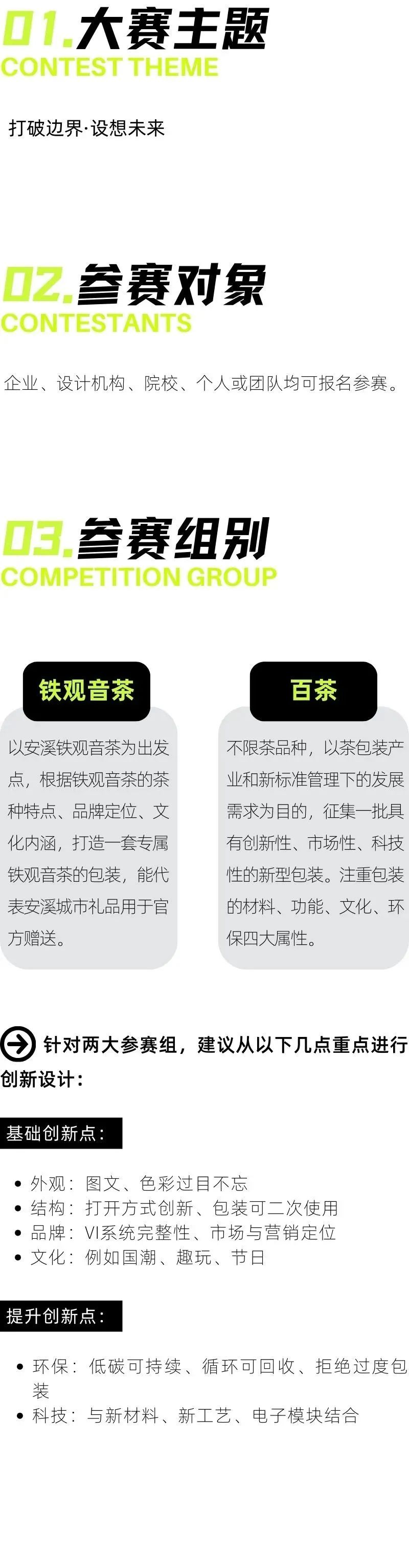 福建省安溪县,以茶闻名世界。立足安溪茶产业优势,安溪茶包装市场也随之发展壮大。由中国茶叶流通协会、清华大学美术学院品牌授权IP设计研究所和海峡两岸茶业交流协会共同指导,安溪县人民政府主办的首届“中国茶都杯”安溪茶包装设计大赛,以“打破边界·设想未来”为主题,旨在提高安溪茶包装的创新度和标准化,设计赋能安溪茶品牌崭新的形象和内涵,焕发安溪茶品牌生命力。