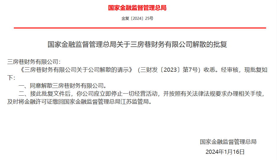 此前,国家金融监督管理总局官网挂出《关于三房巷财务有限公司解散的批复》,