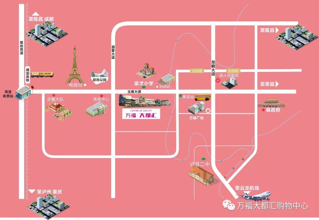 万福大都汇毗邻泸县龙脑大道、玉蟾大道、酒香大道三大城市主干道,纵横的交通网路,通达城市南北东西,雄踞泸县的财富通道。项目商业总面体量逾8万平米,由大型SHOPPING MALL购物中心、时尚商业街区三大功能板块构成,集“超市、百货、餐饮、休闲、娱乐、影院、家居”等于一体,全力打造泸县首个 “一站式”、“全业态“、“大品牌”消费体验的商业中心, 满足全县人民丰富多彩的消费需求。是泸县首个集高档购物中心、娱乐中心、高级酒店、时尚步行街等多种功能于一体的第三代城市综合体。