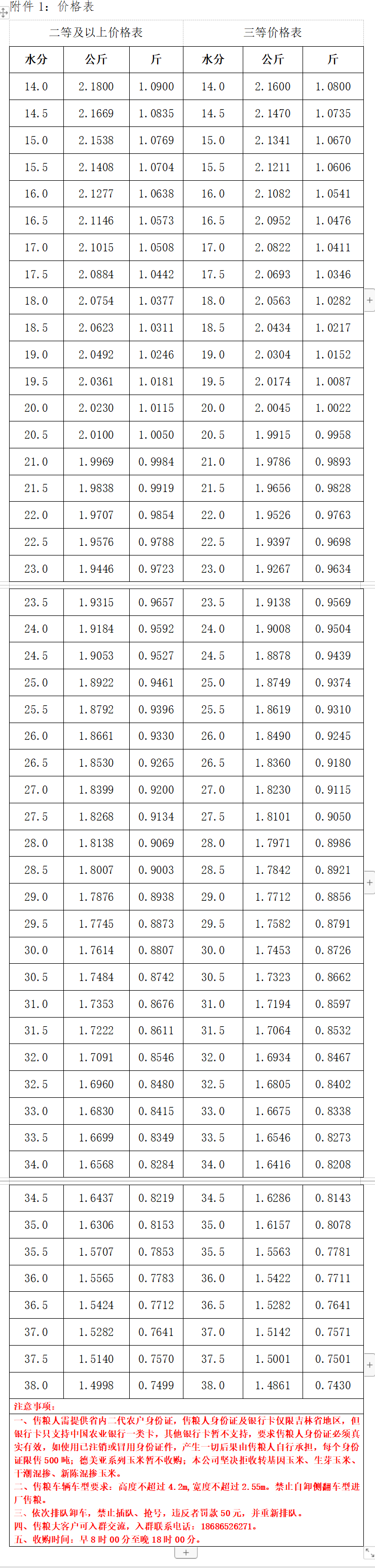 从2024年1月30日9:00时起,公司对门前潮玉米收购价格进行调整,具体价格及指标如下: