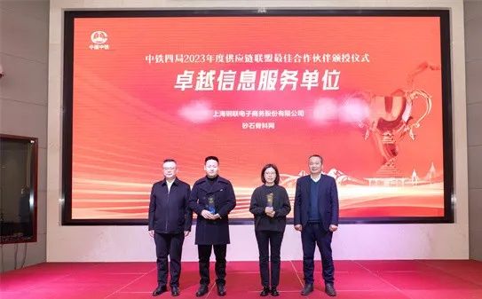 现场,中铁四局还颁发了2023年度供应链联盟最佳合作伙伴奖,砂石骨料网荣获“卓越信息服务单位”,砂石骨料网总经理助理陈尧(左二)代表领奖。