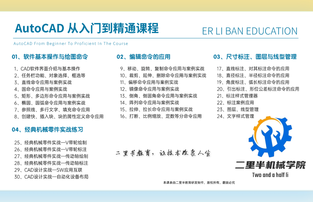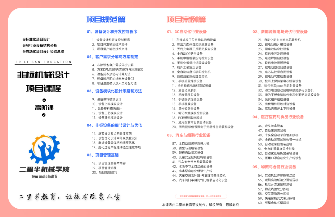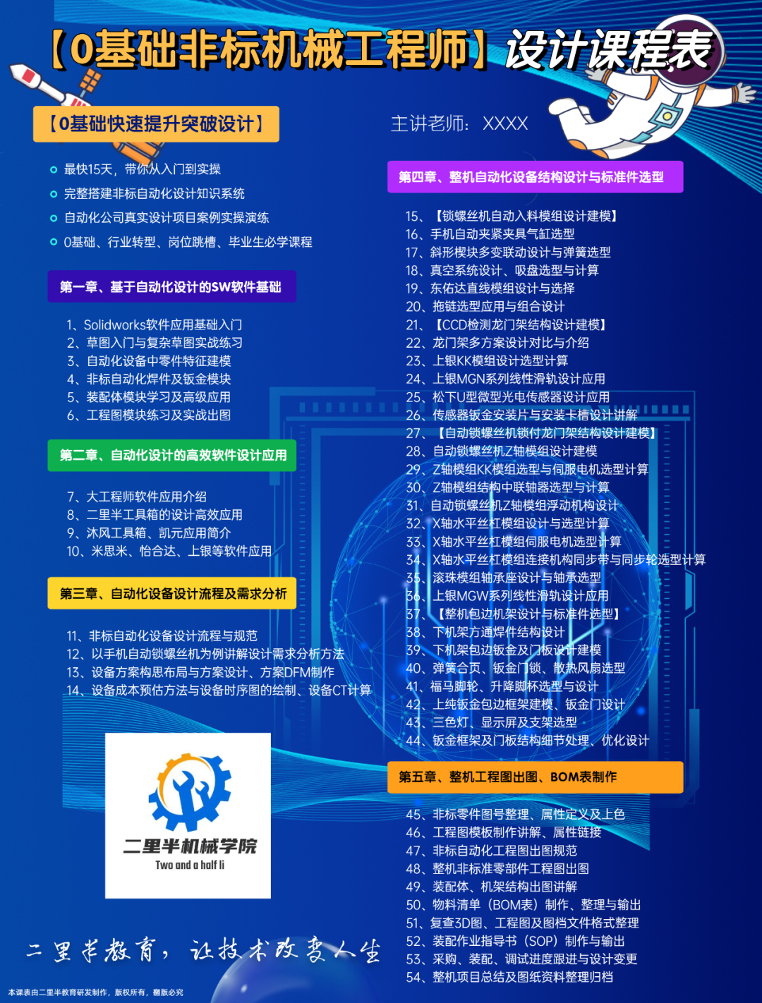 这是一套从零基础到精通的课程,所涉及到的知识非常广,基本上把目前机械工程师就业主流行业的设计知识都囊括进来了,从软件到设计,再到项目管理等等,下面是我们的课程表!