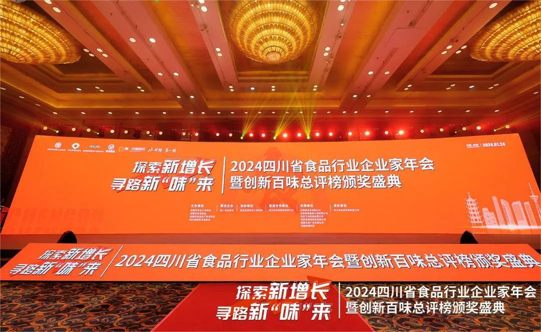 2024年1月24日,由成都市食品工业协会、成都市食品商会等主办的2024四川省食品行业企业家年会暨创新百味总评榜颁奖盛典在成都香格里拉酒店举行。数千位企业负责人齐聚一堂,共商食品行业2023年的成果和2024年的发展战略。