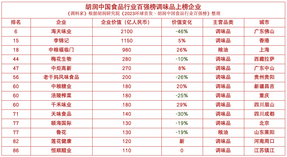 榜单显示,共有共有14家调味粮油企业上榜。其中,包括海天味业、梅花生物、老干妈、涪陵榨菜、天味食品、颐海国际和鲁花在内的7家企业的价值出现了不同程度的下跌,而李锦记、中粮福临门、中炬高新、中粮糖业和千禾味业5家企业价值出现了上涨,另有恒顺醋业的价值未发生变化,莲花健康则为首次上榜。