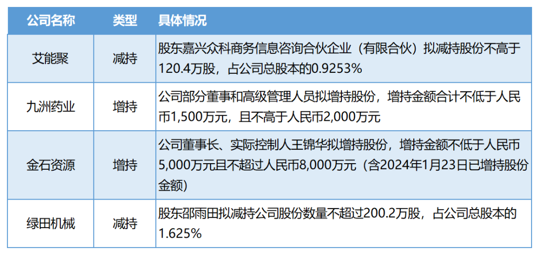1月22日,公司公告,因公司存在公开发行文件编造重大虚假内容,2019年、2020年年度报告存在虚假记载等情形,深交所决定对公司给予五年不接受其提交的发行上市申请文件的处分,对公司时任董事长、总经理章笠中给予公开认定十年内不适合担任上市公司董事、监事、高级管理人员的处分,对思公司给予公开谴责的处分,对公司时任董事长、总经理章笠中,时任财务总监王凛,时任副董事长、副总经理、董事会秘书孙新军,时任监事会主席、职工监事汪骏给予公开谴责的处分。1月25日,公司公告,因公司存在重大资产交易信息披露不完整,未按规定及时披露由资产评估机构出具的资产评估报告,损害了投资者的知情权,上交所决定对公司时任董事长蒋旭峰、时任总经理赵云池予以监管警示。1月22日,公司公告,公司拟使用自有资金回购股份用于实施员工持股计划或者股权激励,回购股份的资金总额不低于人民币0.5亿元,不高于人民币1.0亿元,回购股份的价格不超过人民币20元/股。1月23日,公司公告,公司拟使用自有资金回购股份用于实施股权激励,回购股份的资金总额不低于人民币20,000.00万元(含),不超过人民币40,000.00万元(含),回购股份的价格不超过人民币7元/股(含)。1月23日,公司公告,公司拟使用自有资金回购股份用于员工持股计划,回购股份的资金总额不低于人民币3,000万元(含)且不超过人民币6,000万元(含),回购股份价格不超过人民币12.89元/股(含)。1月24日,公司公告,公司拟使用自有资金回购股份用于实施员工持股计划或股权激励计划,回购股份的资金总额不低于人民币10,000万元(含),不超过人民币20,000万元(含),回购股份价格不超过8.6元/股(含)。1月24日,公司公告,公司实际控制人之一、董事长张樟生提议公司以自有资金回购股份,并在未来适宜时机将回购股份用于股权激励或员工持股计划,回购股份的资金总额不低于人民币3,000万元(含),不超过人民币4,000万元(含)。1月24日,公司公告,公司拟使用自有资金回购股份用于实施股权激励计划或员工持股计划,预计回购总金额在2,500万元至5,000万元,回购价格不超过人民币31.30元/股。1月25日,公司公告,公司拟使用自有资金回购股份用于员工持股计划,回购资金总额不低于人民币1亿元(含)且不超过人民币2亿元(含),回购价格不超过人民币11元/股(含)。1月25日,公司公告,公司拟使用自有资金回购股份拟全部用于实施员工持股计划或股权激励,回购资金总额不超过人民币3,000万元(含),不低于人民币1,500万元(含),回购价格不超过人民币25元/股(含)。1月25日,公司公告,公司拟使用自有资金回购股份拟用于股权激励计划,回购资金总额不低于人民币5,000万元(含),不超过人民币10,000万元(含),回购价格不超过人民币16.92元/股(含)。1月26日,公司公告,2024年1月25日,公司完成回购,已实际回购公司股份18,470,115股,占公司总股本的3.81%,回购最高价格22.70元/股,回购最低价格17.96元/股,回购均价20.57元/股,使用资金总额379,999,230.36元(不含交易费用)。1月26日,公司公告,公司拟使用自有资金回购股份用于股权激励或员工持股计划,回购资金总额不低于人民币1亿元(含)且不超过人民币2亿元(含),回购股份的价格为不超过人民币34元/股(含)。1月26日,公司公告,截至2024年1月25日,公司完成回购,已实际回购公司股份212,041股,占公司总股本的0.27%,回购最高价格为166.50元/股,回购最低价格为77.20元/股,回购均价为146.31元/股,成交总金额为31,024,349.27元(不含交易费用)。1月27日,公司公告,公司拟使用自有资金回购股份用于后续实施股权激励或员工持股计划,回购资金总额不低于人民币1亿元(含),不超过人民币2亿元(含),回购股份的价格为不超过人民币25元/股(含)。1月27日,公司公告,公司拟使用自有资金回购股份用于员工持股计划或股权激励,回购资金总额不低于人民币4,000.00万元(含),不超过人民币8,000.00万元(含),回购股份价格上限不高于10.00元股(含)。文章内容仅作为参考