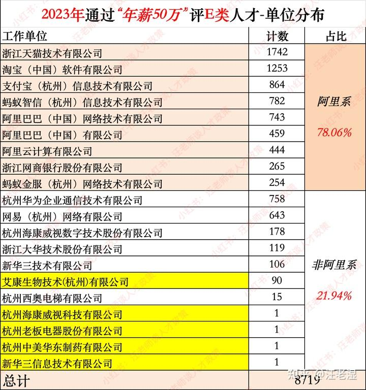 而用上面建立的朴素标准,我认为在前期阶段只包含两种情况,即大厂和其它……这里大厂除了 BAT,还包括在细分行业、市场独占鳌头,利润率较高,职业产出占比也高的独角兽型企业。具体有哪些大家要自己查财报求证,我就不做举例,以免和实际有偏差产生误导。只有这些“正经的”互联网企业,才能给我们这些互联网岗位提供最好的发展空间和回报,如果我们不瞄准互联网企业却一直盯着实业、制造业,除非你自己真的对那个行业感兴趣,否则相同的投入下你的回报一定是远远低于互联网企业的。排除大厂以外,退而求其次,就是一些中小型的优质项目团队,这个并没有作为主要推荐选项之一,是因为这类团队现在太稀缺了。国内的互联网环境再免费制度下摧毁了优质中小型产品的发展空间,我们没办法大量涌现类似 Fimga、Notion、Sketch 这类名利双收的中小型产品,当缺乏外部投资人输血就很难生存下去。自然无法提供足够的就业岗位和发展空间,能不能找到就纯看运气,这是国内互联网市场的缺陷。而除了互联网相关企业外,其它类型的企业能不能获得足够的职业发展空间,我是持悲观态度的,原因上面也说了。而最后一个问题,大厂和优质的互联网企业并不多,怎么可能人人都去大厂,或者一个刚入门、转行的菜鸟也进不去啊!这就要面对一个残酷的事实,高级、优质、顶尖、有潜力的岗位,只会是少数。从我们探索有发展潜力和增长性这件事上本来就预设了一个前提,即某些岗位比另一些更好,这是一种比较优势。在比较中,能让我们满意的比例注定不会太大,因为我们自然是看不上中等偏下和垫底的那一波。而我们看不上的这些就一定不行嘛?也要看比较的对象,如果把这些岗位(暂时不考虑技能要求)提供给更底层的对象或者身处灾难的群众,那可能它们比你眼中的大厂还有吸引力。如果进不了优质的岗位,就只有两种选择,接受现状或者蓄力待发。接受现状不用多说,一般打工人嘛,普通老百姓嘛,过日子嘛……做个普通的岗位拿着凑合的工资过好自己的生活,在哪工作不是工作...只要你从心态上 “躺” 了,工作中大多的坎坷都能看淡。在你也没比其它人多优秀多努力的情况下,你的收入参考当地平均水平,如果能高出50%到1倍,还有什么好纠结的?另一种情况,就是你不愿意接受这种情况,想要混出点成绩怎么办?那你只有大厂一条路去走。虽然这话说的有点绝对,但是其它路径的成功概率远远低于你进入大厂并获得远超平均线的收入水平。比如今天正好看到的一张图表,在杭州市政公布 E 类人才(纳税5亿以上的高新技术企业员工)统计数据里,阿里的人数占比是非常可观:但要说阿里的人才就一定都比外面的其它公司的人更优秀,一家公司吸收了同类里面最好的80%的人才,这个结论你们自己信嘛?原因就是因为公司的红利和平台,带来了超额的收益,而不是真的因为这80%里的个人全都遥遥领先不足这个薪资水平的人。当你前期阶段真的感到迷茫和选择困难的时候,不要再浪费时间考虑一些你根本不了解的行业,发展良好的概率很低,和赌博差不了多少。而大厂的岗位虽然不全都是香饽饽,但它们是具有确定性收入和增长空间(职级)的,你能做的最简单的选择就是以它们为目标去增长。作为看过无数职业发展案例的过来人,进入大厂和在大厂中晋升的难度,虽然门槛不低,但远远比你们在一般行业获得成功和同等收入的难度低得多的多,而多数人是看不明白这个道理的,只是在最初级的门槛上望而却步,然后去追赶那种长期更难实现的目标。虽然你们现在还在普通公司普通行业它们没有增长空间,但你们真的想发展就可以扩充自己的技能和知识,为进入大厂做准备,而不是漫无目的的乱选蹉跎岁月。虽然听起来可能很奇怪,但我对你们最终的建议,就是进入大厂,或者处于进入大厂的路上。