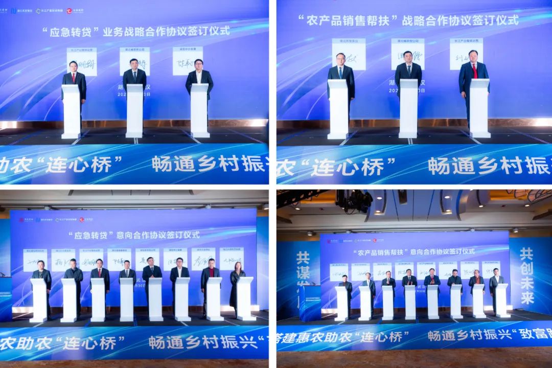 活动现场,湖北省农业信贷融资担保有限公司、湖北省中小企业金融服务中心有限公司、湖北长江产业载体运营管理有限公司、湖北农发实业集团有限公司共同签署了“应急转贷”服务、“农产品销售帮扶”服务战略合作协议,并与相关农业企业签订了意向合作协议书。多方签订战略合作协议,将进一步构建金融协同支农“生态圈”,为全省农业企业生产经营打造“全周期支持、全链条集成、全要素保障、全流程风控、全天候服务”的一站式服务平台,积极为农业强省和农业农村现代化建设作出贡献。