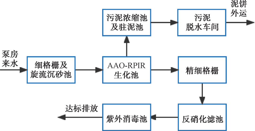 本工程污水处理采用“粗格栅提升泵房(现状)+细格栅旋流沉砂池+AAO-RPIR生化池+精细格栅+反硝化滤池+紫外消毒池”工艺,工艺流程如下图1所示。