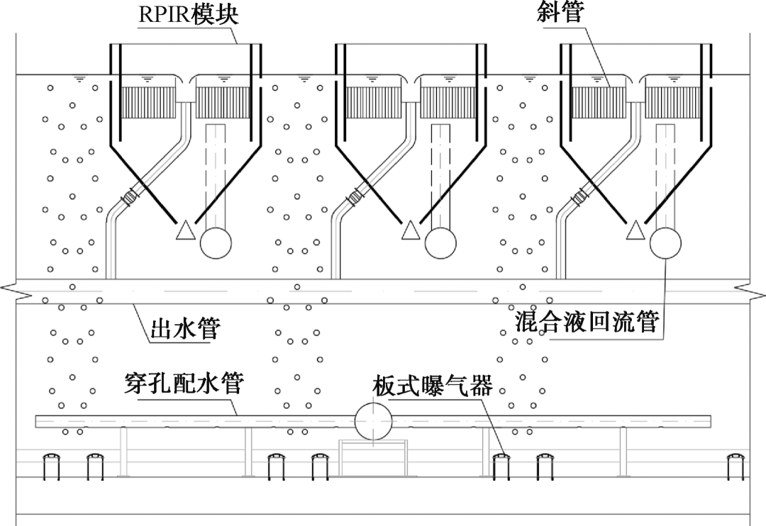 ②RPIR好氧池水为池底进水,池顶出水,需在池底均匀布置穿孔配水管,污水通过曝气的驱动在RPIR模块内形成环流,更有利于活性污泥与有机物接触,提高传质效率;