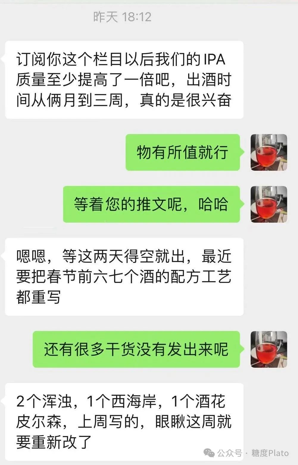 最近还请教了做知识付费的朋友,说需要的酿酒师始终都会订阅的,只是目前还不知道这个栏目的价值所在,要让订阅了的用户宣传才行,有些酿酒师愿意分享,有些只管自己进步不愿意分享,不能强求,还有些订阅用户到现在都没有加过微信,还是希望大家能多多分享学习体会,这些技术干货也都是美国顶尖酿酒师分享的,精酿行业的蓬勃发展离不开您的分享,发些最新的用户反馈