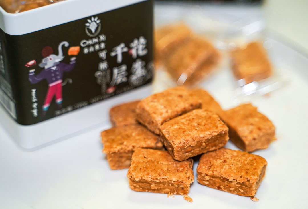 春山喜食花生千层,切面可以看到细小的花生粒,金亮亮的小糖丝儿,这款花生酥我们独家定制的。这款很难得,工序繁复精细!