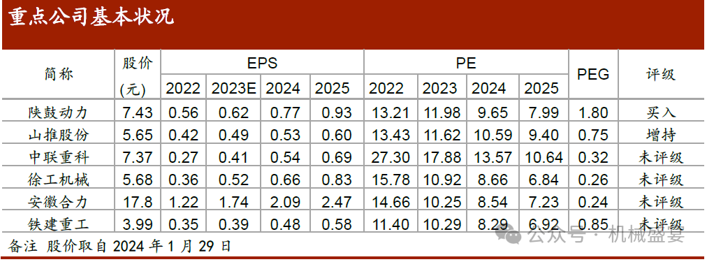 ①国资委指出利用增持、回购等手段传递信心。当前市盈率较低,市值低估,但有持续增持、回购计划的央企上市公司,有望受利好消息影响,市值预期回升。我们以市盈率和增持、回购数量为指标筛选有望修复市值的企业。②同时应当关注盈利能力强,有较大分红空间的企业,以及高股息却估值折损的企业。未来股利分红将成为中特估企业投资收益的重要部分。我们以市盈率、股息率、净利率及净利润增速为标准,筛选有望通过稳定较高水平股息率以实现市场价值的企业。重点关注标的:①陕鼓动力:国内透平机械龙头,核心产品轴流压缩机全球龙头,注重产品研发,完成300MW级压缩空气储能高温压缩和350MW级压缩空气储能中温压缩的系统方案开发,在储能领域前景广阔。②山推股份:推土机行业龙头,具备推土机、压路机、装载机等主机产品及工程机械零部件全面发展的完整产业链,海外市场拓展顺利。③中联重科:主要从事工程机械、农业机械等高新技术装备的研发制造,具备多元化产品结构,挖机、高机、农机发展迅速,海外市场不断扩展。2024年,由中联重科自主研制的首台百吨级全国产化电传动矿用自卸车ZTE210在湖南长沙下线。④徐工机械:中国工程机械行业头部企业,产品多元化发展,压路机、摊铺机、平地机多项核心产品市占率领先,入选KHL发布的2023年全球前50强工程机械制造商榜单。⑤安徽合力:国内叉车行业龙头,受益叉车锂电化转型趋势,业绩稳健增长,盈利能力凸显,逐步走向全球市场。⑥铁建重工:主要从事掘进机装备、轨道交通设备和特种专业装备研发制造,注重自主研发,产品体系完善。