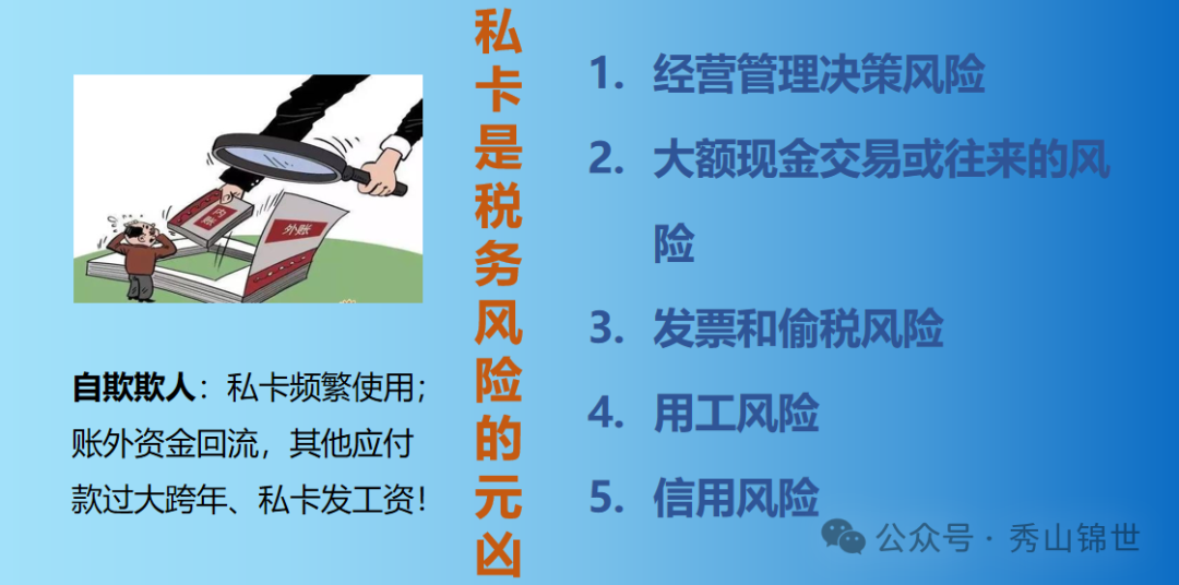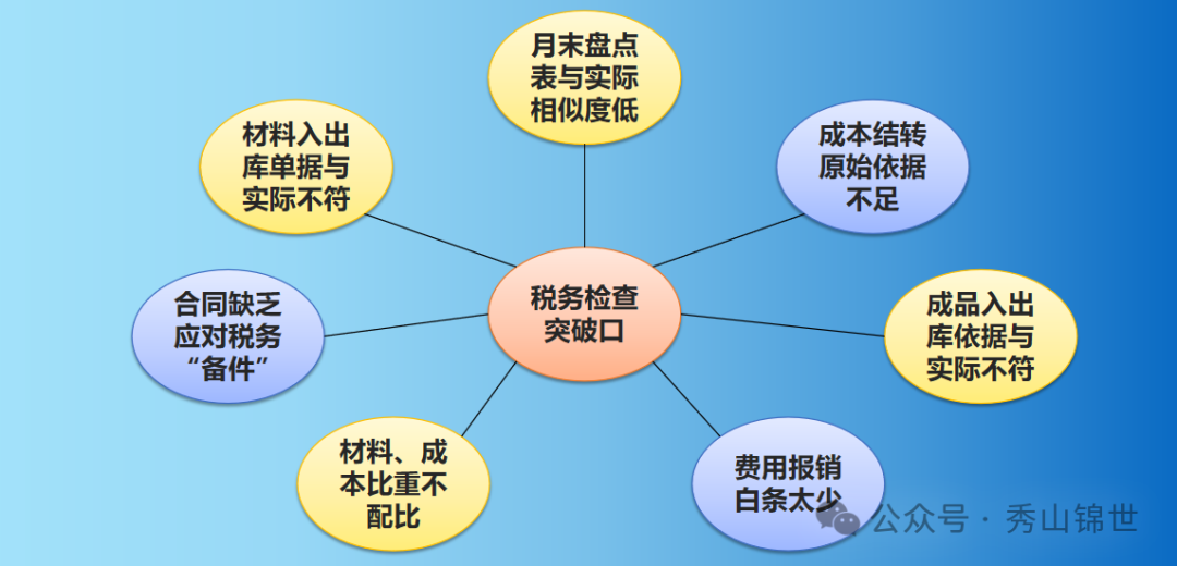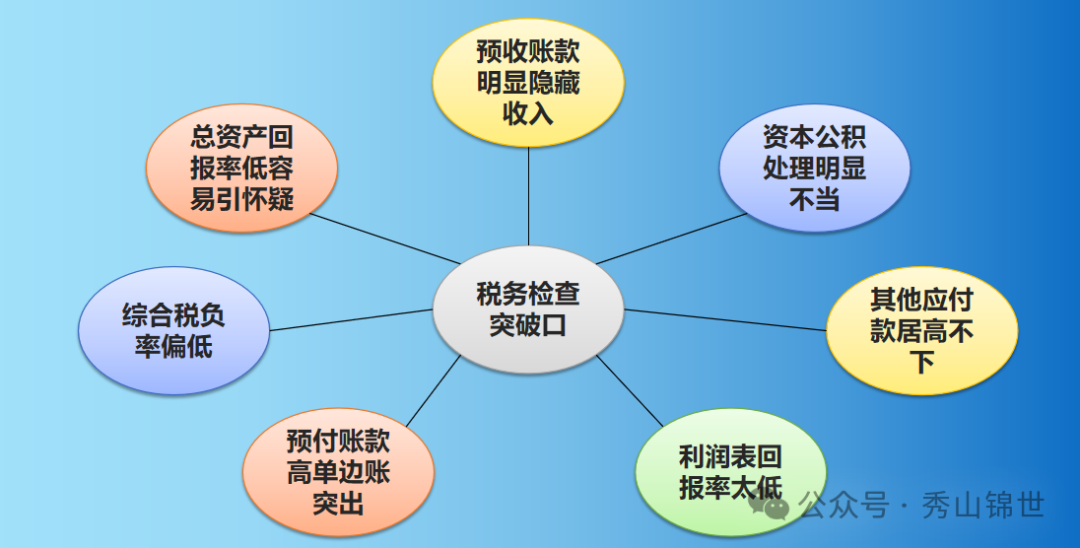 这张图看起来会直观一些,我们所说的财务指标的风险点也是税务检查的突破口;都是老板们平时应该注意的事项,也是平时最觉的麻烦,得过且过的点;小隐患会留下大问题,经营过程中,各位老板一定要注意。