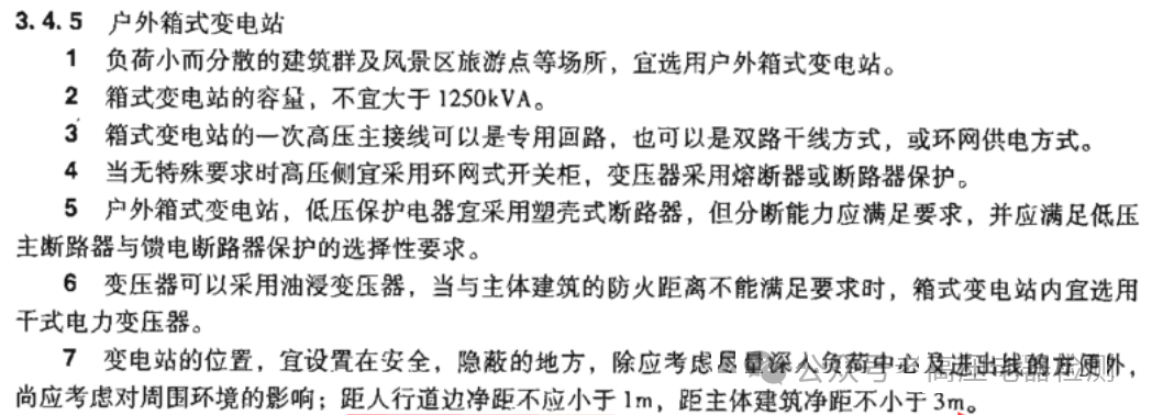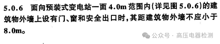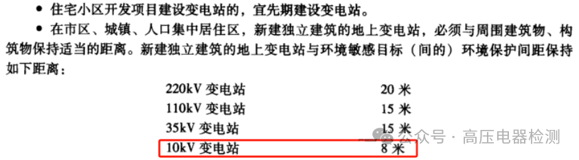 4.2.3 室外配变电所的外侧指独立式配变电所的外墙或预装式变电站的外壳。配变电所离住户太近会影响居民安全及居住环境。防火间距国家现行的消防规范已有明确的规定,国家标准《环境电磁波卫生标准》GB 9175仍在修订中,目前没有明确的技术参数。离噪声源、电磁辐射源越远越有利于人身安全,但实施起来有一定的难度。考虑到住宅建筑的特殊性,建议室外变电站的外侧与住宅建筑外墙的间距不宜小于20m,因为10/0.4kV变压器外侧(水平方向)20m处的电磁场强度(0.1MHz~30MHz频谱范围内)一般小于10V/
