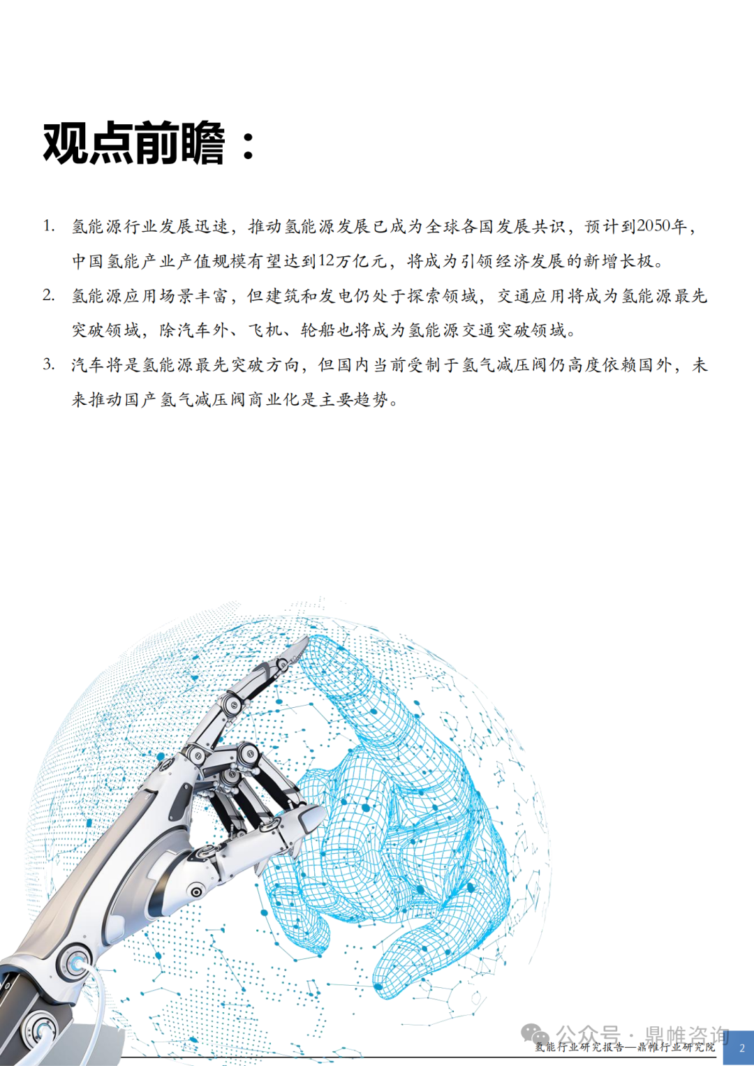 1. 氢能源行业发展迅速,推动氢能源发展已成为全球各国发展共识,预计到2050年,中国氢能产业产值规模有望达到12万亿元,将成为引领经济发展的新增长极。