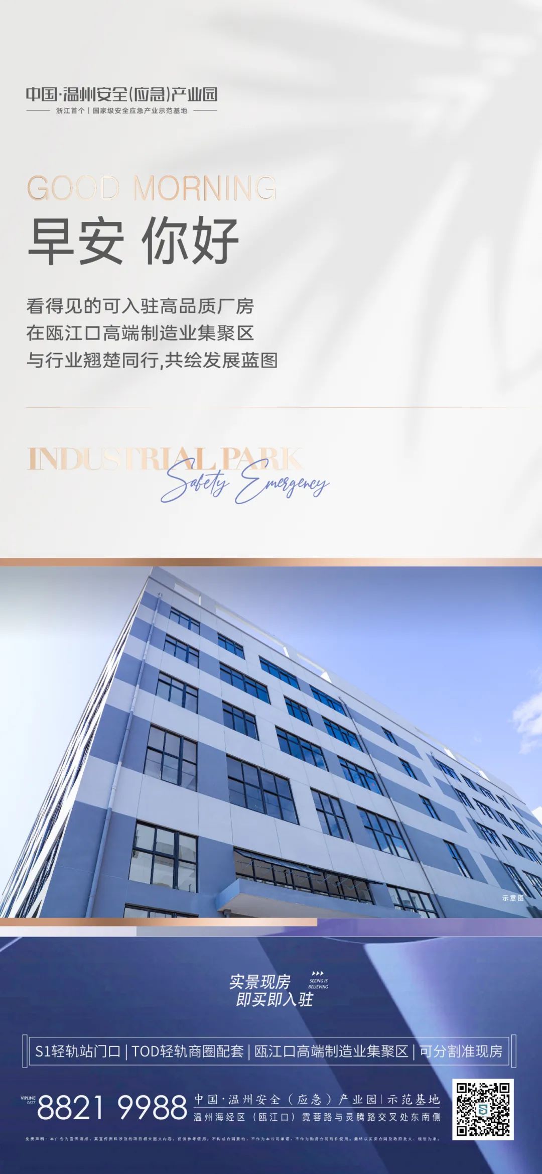 中国·温州安全(应急)产业园,由天心天思集团倾力打造,浙江省第一个国家级安全产业示范基地,温州市重点建设工程,总建筑面积约37万㎡。园区坐落于瓯江口核心,与轻轨S1双瓯大道站直线距离约50米融合轻轨、港口、高速、高铁等多种便利的海陆空交通方式,打造中国安全应急智能装备集聚地。建有建面约1000~18000㎡不等的产权独立厂房,多种户型,鼎配层高,全方位满足企业所需。周边建有高级人才公寓、温州外国语学校、温州附二医等全维度配套设施,打造产城融合生态园区。依托天心天思集团在数字企业智能服务领域的强大优势,围绕产业主题,以高能级平台为基础,形成一套“科研院所+龙头企业+产业基金+高层次人才+产业运营”为标准化的运营模式,以金融推动科技成果产业化,赋能企业转型升级,促进温州安全应急产业高质量发展。