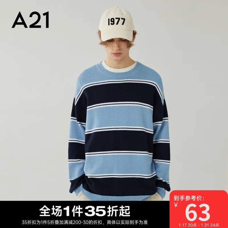 这是一款A21品牌的毛衣,它采用了92%的棉质材料,柔软舒适,透气保暖。它的版型是宽松型,领型是圆领,图案是时尚的条纹,颜色是灰蓝色,非常适合秋季穿搭。这款毛衣可以搭配牛仔裤或休闲裤,给您带来轻松自在的感觉。无论您是去上班,还是去约会,这款毛衣都能让您展现出自信和魅力。