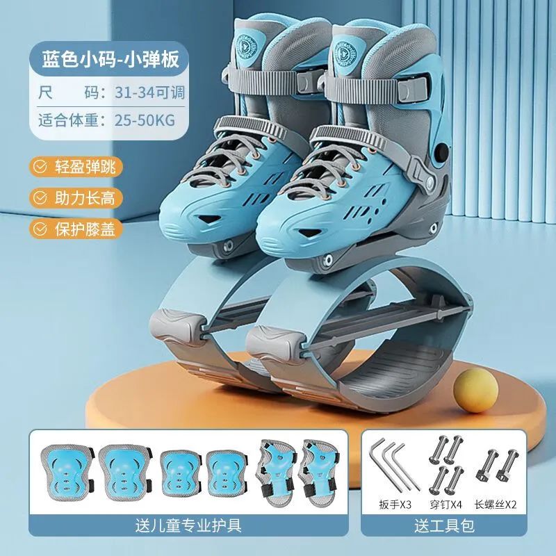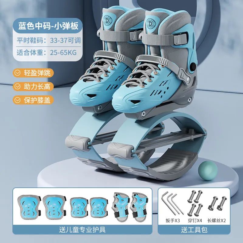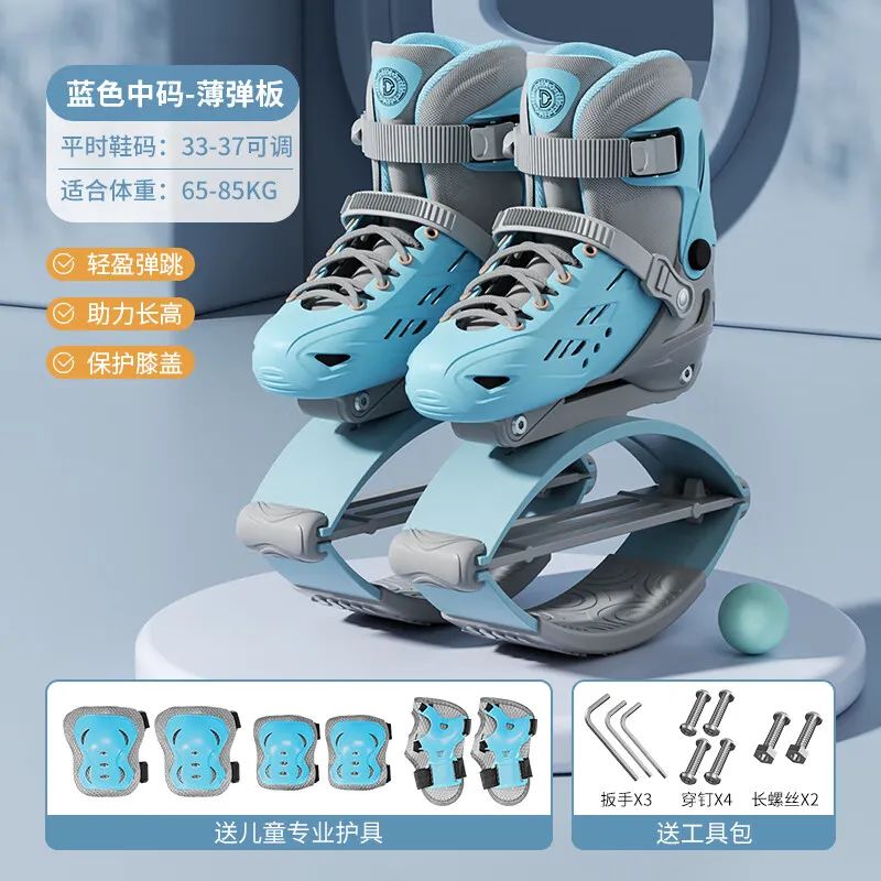 Messiant(MM)设计的,它采用了仿生学原理,根据袋鼠的腿仿制而成,可以产生强力的弹性,推动运动者跳得更高1。它有两种规格,一种是适合青少年的40-60KG,一种是适合儿童的30-50KG,颜色有红、蓝、黑三种,随机发货。这款弹跳鞋非常适合户外运动,可以锻炼身体的协调性和平衡感,还可以增加身高和体重,让你变得更加健康和自信。