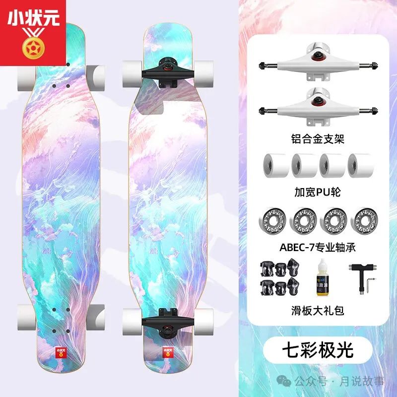 这款长板是小状元京东自营旗舰店的热销产品,它采用了加拿大枫木板面,强度高,耐磨性好,不易变形。它的轮子是七彩极光闪光轮,不仅美观,还能提高夜间骑行的安全性。它的轴承是碳钢轴承,转动灵活,速度快,适合公路刷街和速降。这款长板是成人女生舞板的首选,它可以让你在滑行中展现优雅的姿态,也可以作为代步工具,方便出行。小状元长板是一款全能的长板,无论你是初学者还是高手,都可以享受滑板的乐趣。