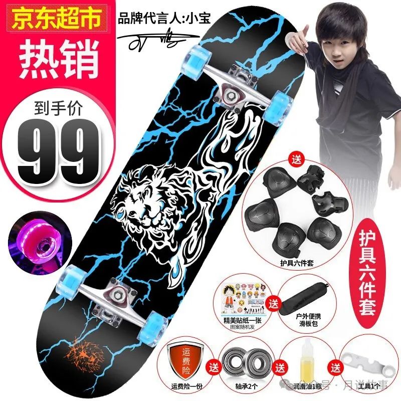 这是一款双翘板滑板,适合成人和儿童使用,它的板身是由七层枫木制成的,坚固耐用,表面还有防滑砂纸,增加了摩擦力,让您滑得更安全。它的轮子是闪光的,不仅美观,还能在夜晚提高您的可见度,避免发生危险。它还配有多护具6件套,包括头盔、护膝、护肘、护腕等,让您在享受滑板乐趣的同时,也能保护好自己。这款滑板的图案是天降雄狮,寓意勇敢无畏,非常适合喜欢挑战自我的您。