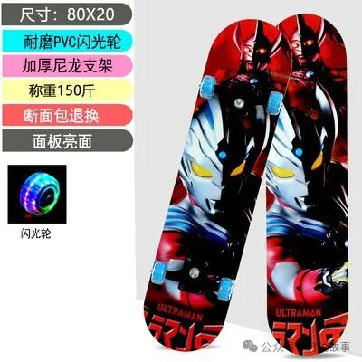 这是一款适合5-18岁的四轮双翘板滑板,它是滑板初学者的最佳选择。它的板身采用了高强度的枫木,经过多层压制而成,既坚固又轻便。它的轮子采用了高弹性的PU材质,可以闪光,增加了滑板的趣味性和安全性。它的支架采用了好尼龙材质,可以有效减震,提高滑行的稳定性和舒适性。它的图案也很有特色,有奥特曼、皮卡丘、芭比娃娃等多种可爱的卡通形象,可以满足不同孩子的喜好。它可以让孩子们在玩耍的同时,锻炼身体,培养平衡感和协调能力,是一款非常实用和有趣的滑板车。