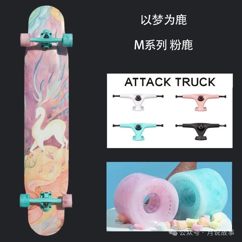 这是一款高端的长板舞板,适合成人和儿童,男女通用,可以玩DC和平花。它的板面是以梦为鹿系列的粉鹿图案,寓意美好和浪漫,非常适合女生。它的桥架是Attack桥,轮子是水晶轮,都是逆山旗下的知名品牌,质量有保证。这款长板的弹性和稳定性都很好,可以让你在滑板上自由地舞动,享受滑行的乐趣。