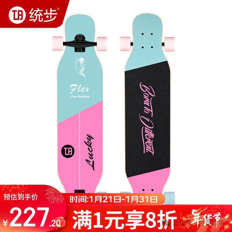 这款长板是统步滑板的专业板,它专为女生和儿童设计,它的板面是中国东北枫木,轻巧耐用,适合舞板和平花。它的轮子是PU材质,弹性好,减震效果佳,适合刷街和跳舞。它的轴承是钢球轴承,噪音低,寿命长,适合初学者和培训。这款长板是一款专业的舞板,它可以让你在滑行中做出各种花式动作,也可以作为儿童的玩具,锻炼身体和平衡能力。统步长板是一款专业的长板,它可以让你在滑板上感受到运动的魅力和乐趣。