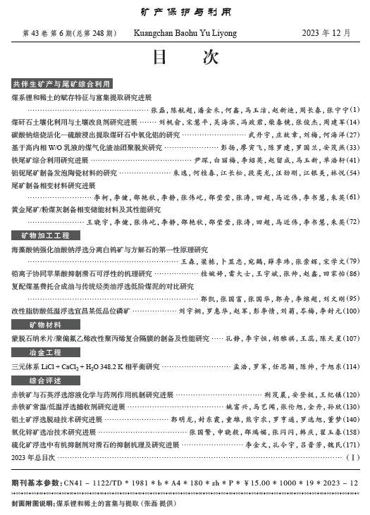 摘要:战略性关键金属锂和稀土是重要的工业原料,对社会发展和国家安全具有不可替代的作用,随着经济发展,锂和稀土的市场供需矛盾日益突出。煤系锂和稀土储量丰富,因此其提取回收受到了世界各国的广泛关注。通过综合分析当前国内外煤系锂和稀土的研究成果,总结了锂和稀土的赋存特征,系统阐述了分选富集和化学浸出方面的最新研究进展。针对现有分选方式富集倍数低、化学助剂消耗量大、废渣废水产量多等问题,建议开发物理−化学联用方式定向富集煤及其副产物中的锂和稀土元素,提升其品位,降低后续化学浸出难度。同时推进煤及其副产物中多种伴生资源协同提取、绿色开发研究,实现煤系资源高附加值综合利用。