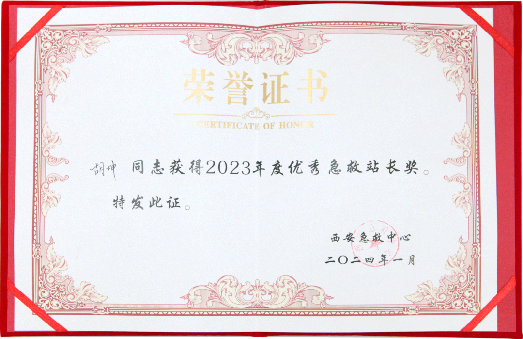2024年1月30日,西安急救中心召开的西安急救中心年终表彰大会中传来捷报,陕西冶金医院急救站荣获2023年度急救站优秀奖,站长胡坤荣获2023年度年度优秀急救站长奖。