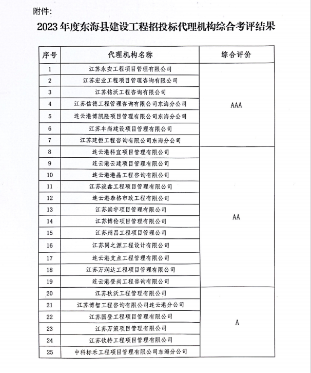 附件:2023年度东海县建设工程招标代理机构综合考评结果