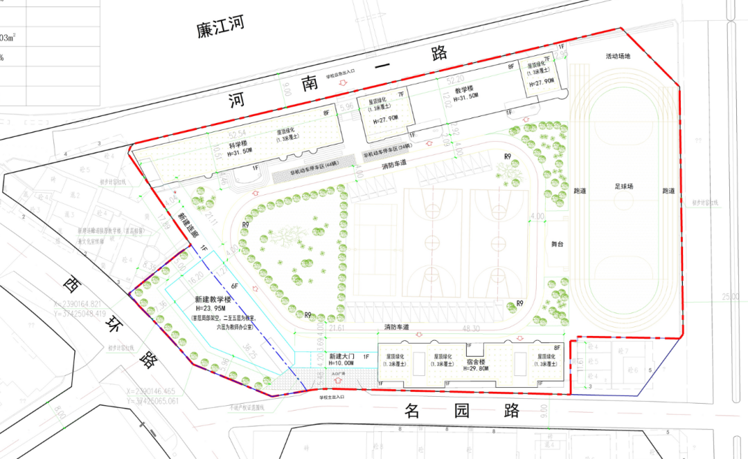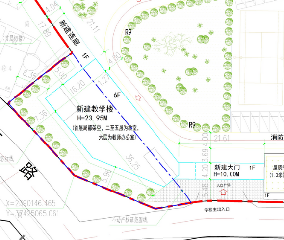 规划显示新建1栋6层高教学楼、新建大门、新那家连廊