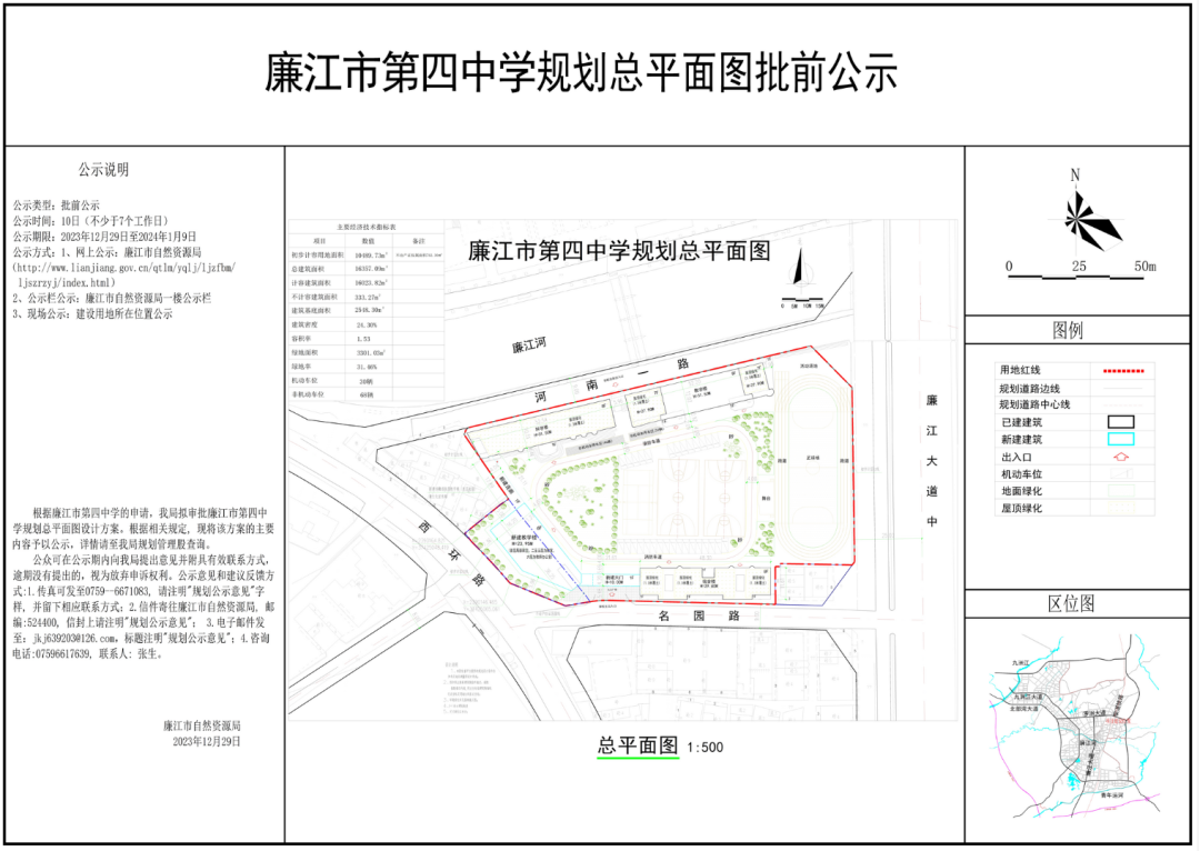 据近日,廉江市第四中学规划总平面图批前公示,规划新建1栋6层高教学楼等。