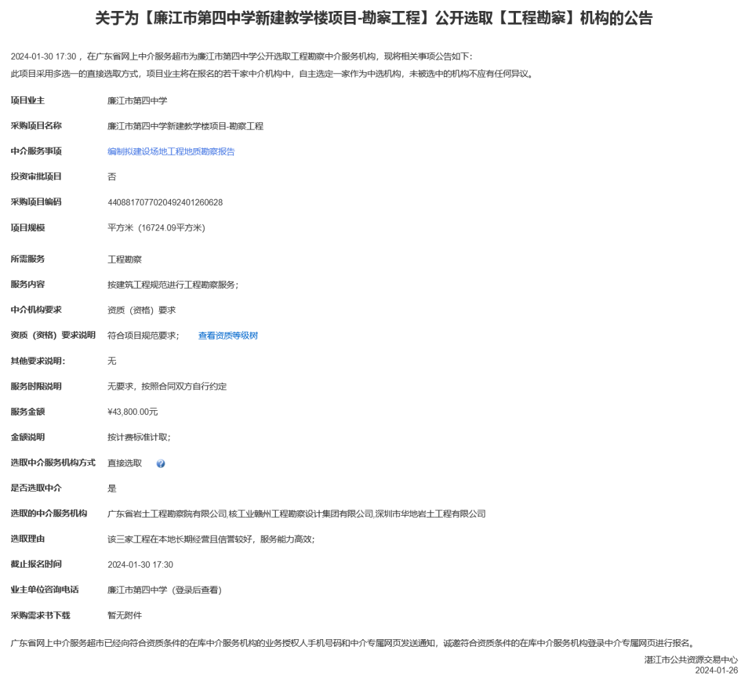 近日,廉江市第四中学新建教学楼项目-勘察工程招标,关于为【廉江市第四中学新建教学楼项目-勘察工程】公开选取【工程勘察】机构。