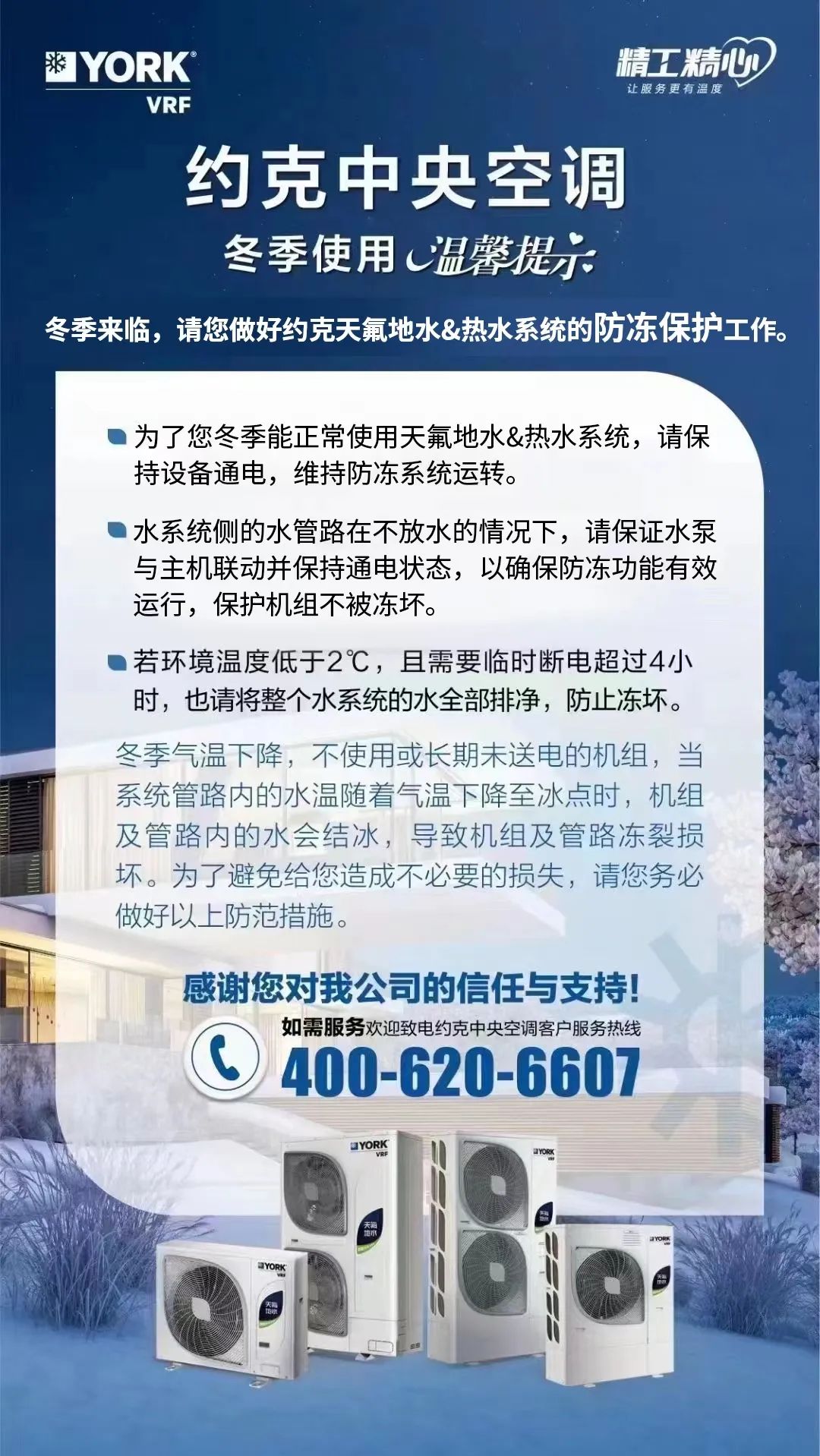 冬季使用中央空调,请保持设备通电,维持防冻系统运转