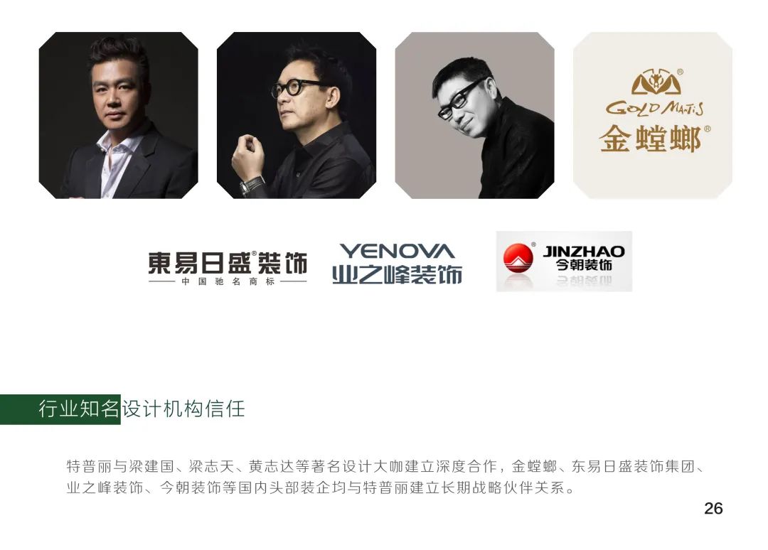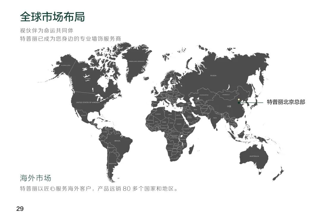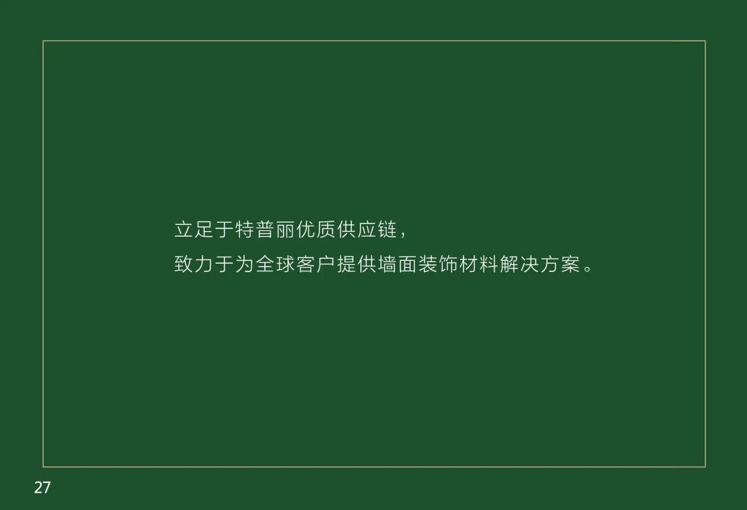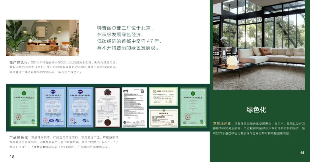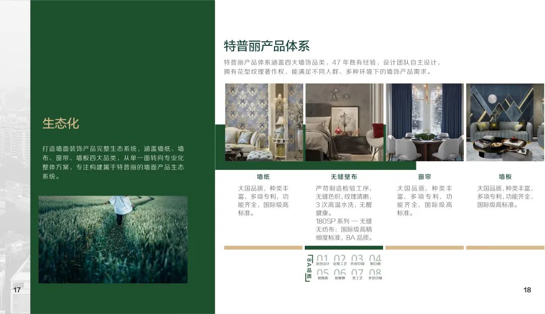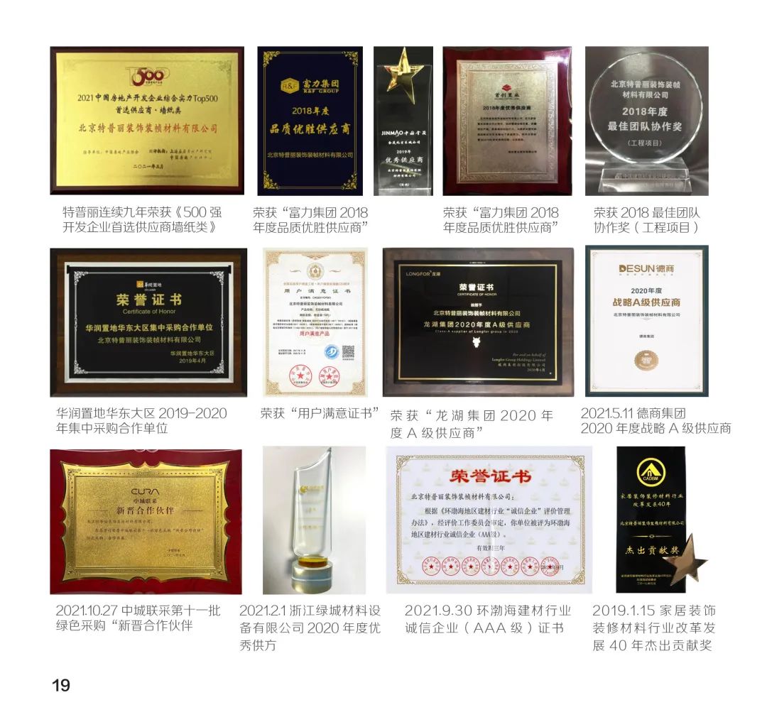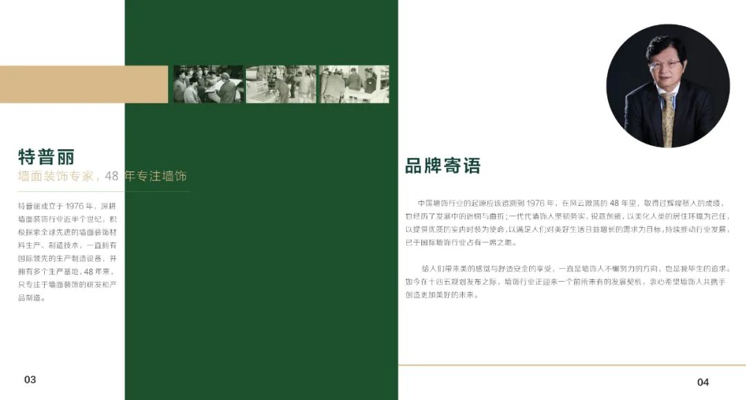 北京特普丽装饰装帧材料有限公司始建于1976年,是生产经营销售墙纸、墙布、窗帘、装配饰板、装饰画等墙面装饰产品的创新型企业。现已发展成集设计、研发、生产、销售、服务为一体的大型墙饰企业,秉承“以质量求生存、以创新求发展;提供先进产品、实现满意服务”的经营理念,40余年来一直活跃在中国墙饰行业的发展中,并不断向时装化、科技化、环保化迈进,目前已跻身世界墙饰市场。特普丽分别从日本、德国、英国、荷兰、意大利等国家和地区引进30余台生产设备,年产能达8000万平米以上。