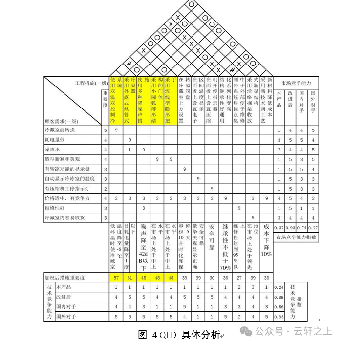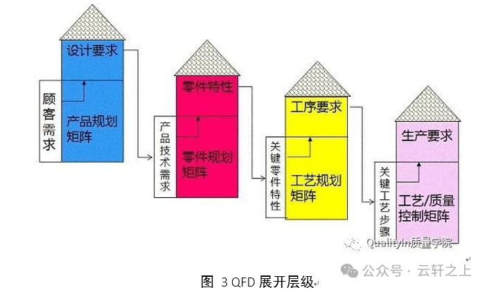 将顾客的呼声转化为初步和可度量的设计要求(采用QFD质量功能展开),如产品的功能、性能、成本要求、可装配性和可更换性等质量功能展开是将顾客要求融入产品开发过程的一种结构性方法,确保整个过程都考虑了顾客的要求。(食品、药品行业关注的是功能、成本、保质等质量。),QFD是从设计一直到生产工艺/质量逐步展开的。(QFD本书就是一个很系统工具,需要专门进行讲解,故此这里不做细讲。)下图是一个QFD的案例,供大家了解一下QFD的逐层展开和特定的展开细节。
