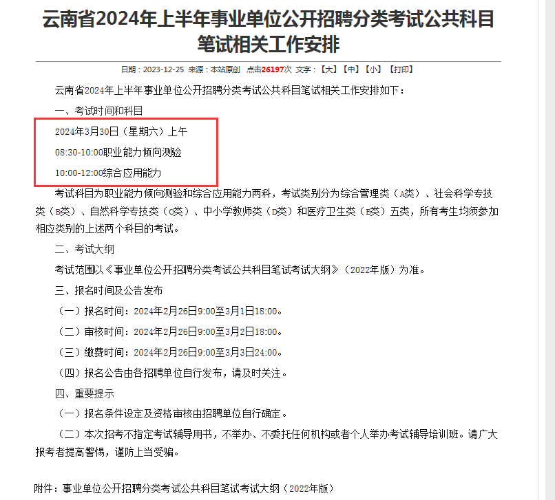 此前,云南官方已发布关于《云南省2024年上半年事业单位公开招聘分类考试公共科目笔试相关工作安排公告》,报名时间:2024年2月26日-3月1日,笔试时间:2024年3月30日笔试!