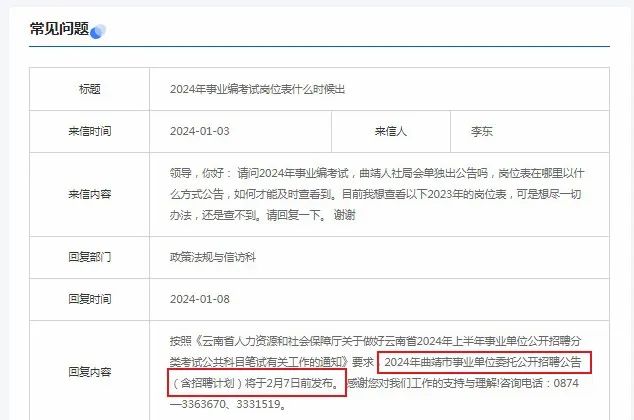 “按照《云南省人力资源和社会保障厅关于做好云南省2024年上半年事业单位公开招聘分类考试公共科目笔试有关工作的通知》要求,2024年曲靖市事业单位委托公开招聘公告(含招聘计划)将于2月7日前发布......”