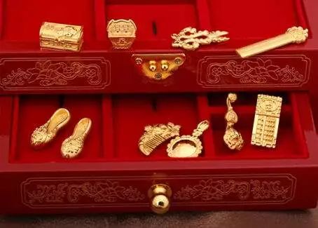 婚庆九宝是结合中国传统婚庆习俗中送嫁或迎娶的礼仪,从中国传统文化精髓中提炼出九个最具代表性的吉祥、富裕寓意的物件,这种将首饰与文化结合起来,从中国传统文化中提炼创意,巧用文化来包装婚庆首饰的创意得到了很好的市场回馈。精巧的小配饰精雕细琢,有九种小配件,故名“婚庆九宝”,取“长长久久”之意。