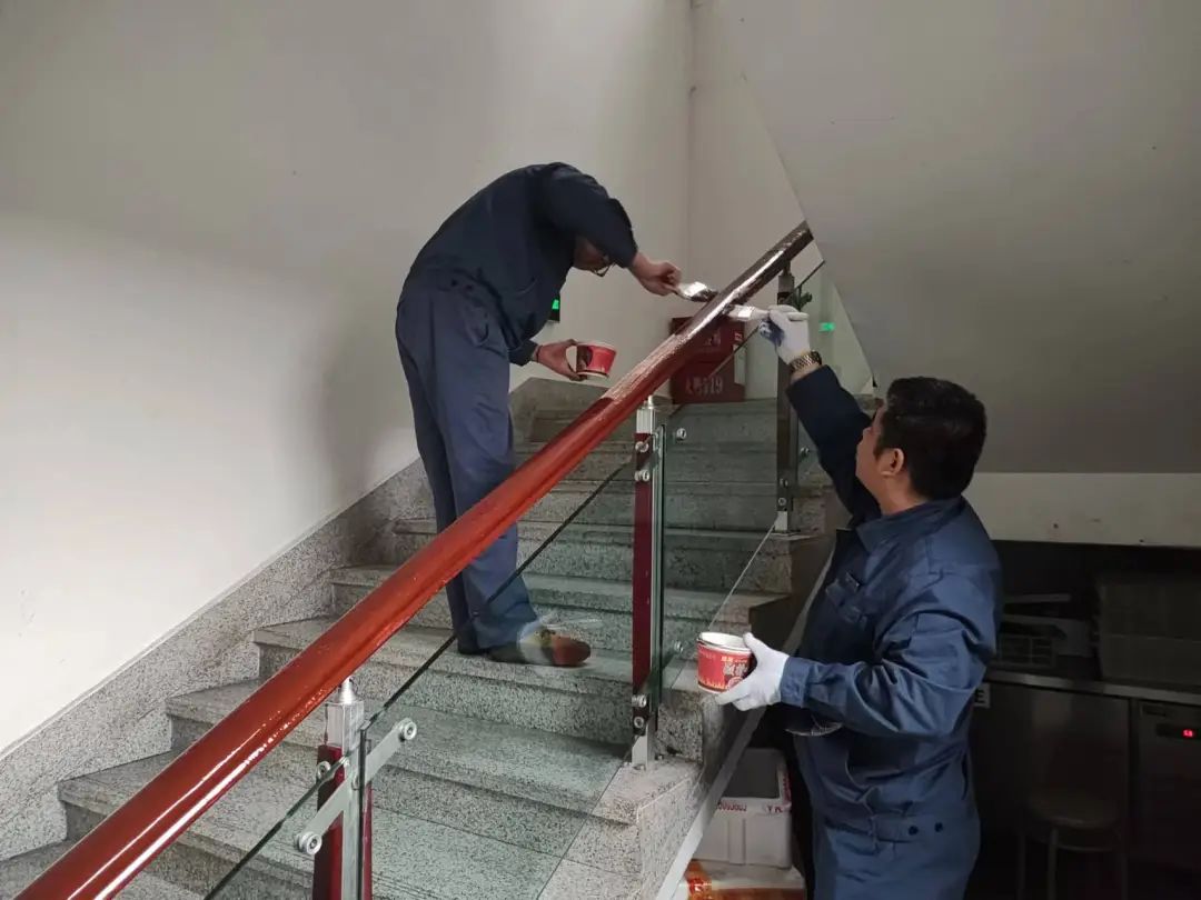13. 维修4F走廊松动地砖9块;粉碎长安支行过期文件;给11F东消梯扶手打磨刷漆2遍。