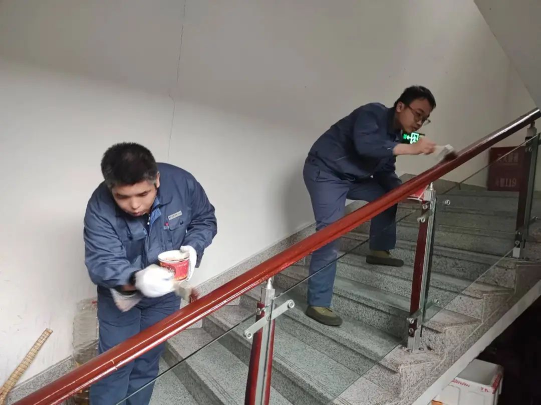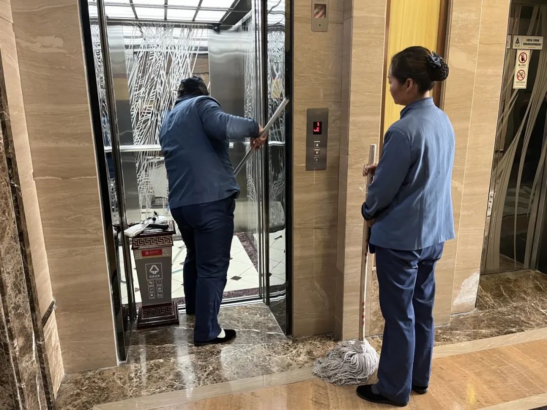20. 细扫东西消梯墙灰并刮东西消梯扶手玻璃。