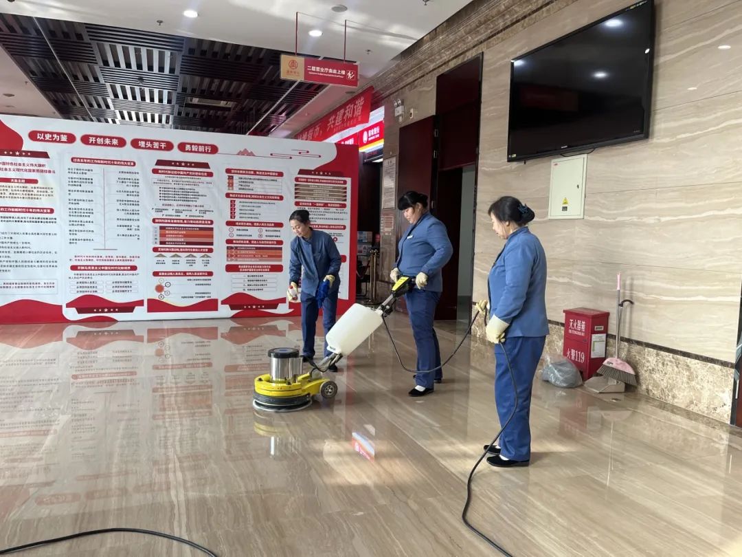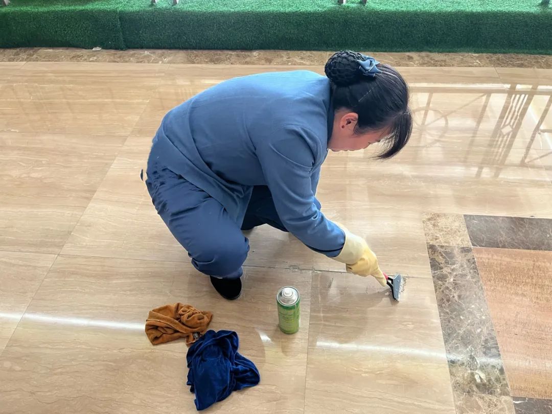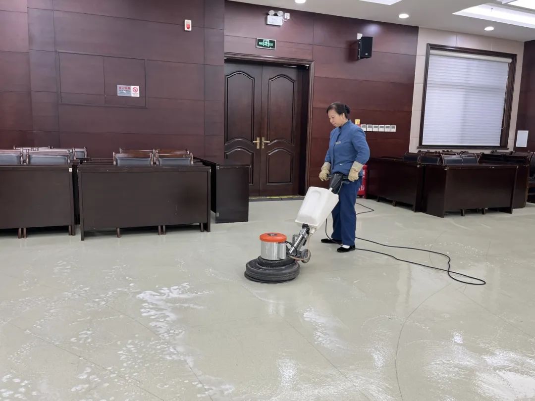 8. 清洗1F大厅所有地坪、墙面(3次);清洗各大门口台阶地坪(2次)。