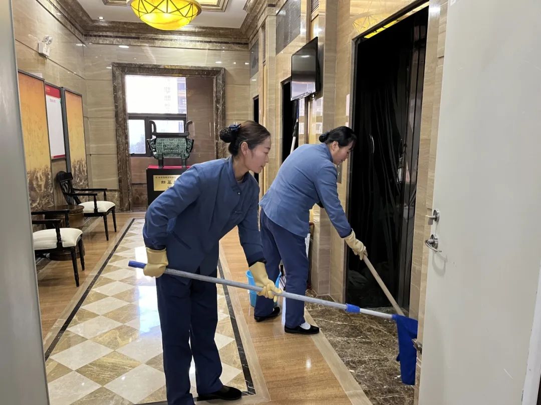 9. 清洗1F-11F公共走道、客梯间、卫生间所有墙面、地面,带门禁玻璃内外。