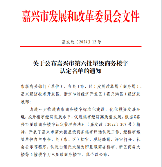 再添荣誉!温州商会大厦A座获评嘉兴市三星级商务楼宇称号