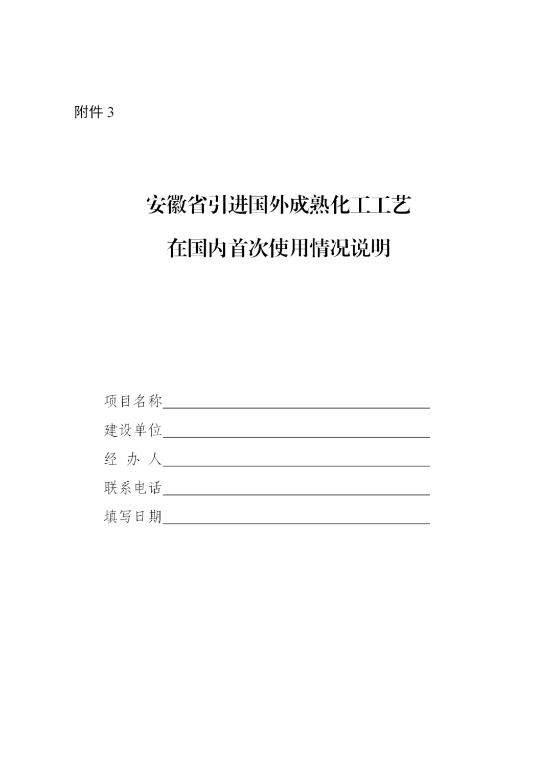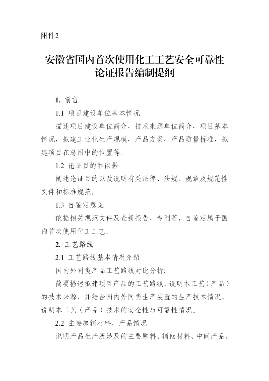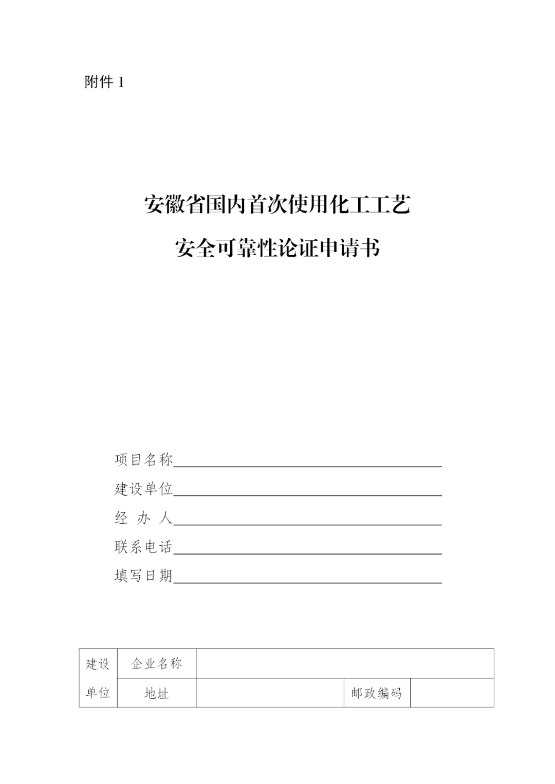 第四条 建设单位拟采用的化工工艺符合本办法第三条第1、2、3、5项情形之一的,应当提交“安徽省国内首次使用化工工艺安全可靠性论证申请书”(见附件1)、“安徽省国内首次使用化工工艺安全可靠性论证报告”(以下简称论证报告,见附件2),国家一级科技查新咨询机构出具的查新报告或工艺、技术、产品等方面的专利、标准及其它相关材料。